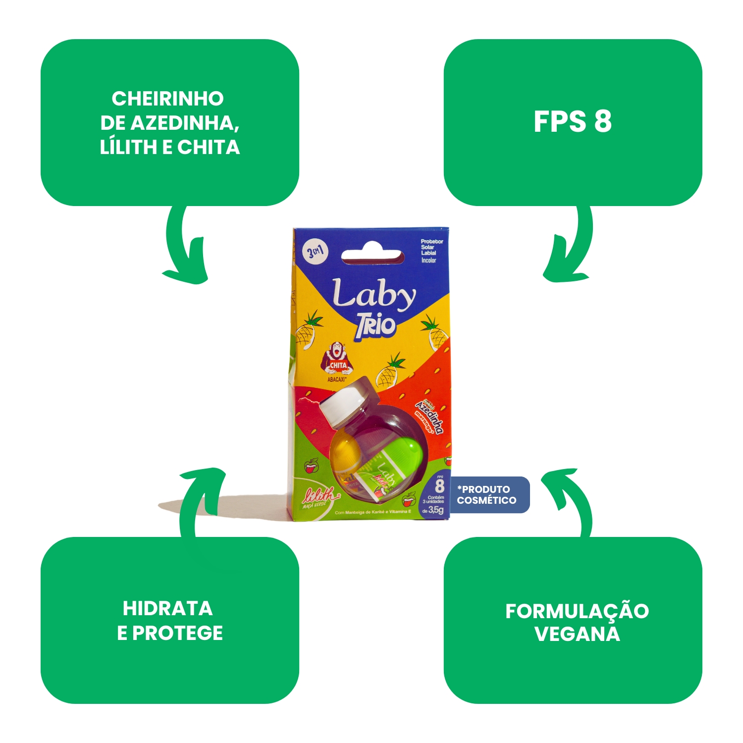 Trio Laby Push Pull – Protetor Labial FPS 8 com Aromas Nostálgicos (Azedinha, Lilith e Chita)